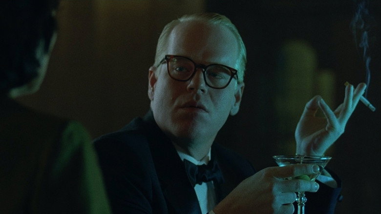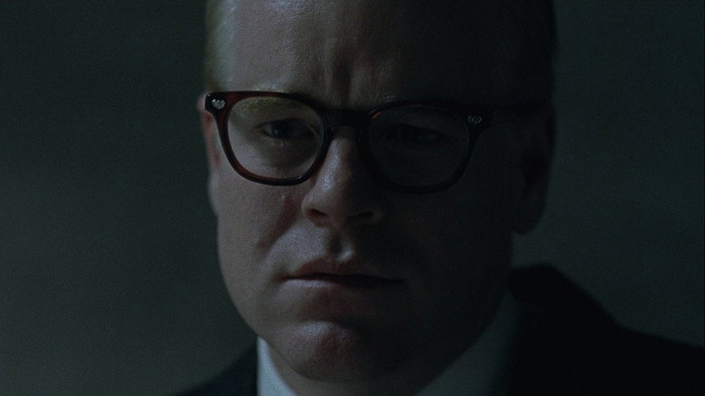 **Um bom filme.** Confesso que detestei este filme na primeira vez que o vi pois detestei a personagem principal. Truman Capote pareceu-me apenas um homem excessivamente egoísta, narcisista e disposto a escrever um romance de sucesso à custa de uma tragédia onde morreram pessoas. Eu fiquei sempre na dúvida se ele estaria realmente interessado em ajudar aqueles homens na prisão ou se estava simplesmente a aproveitar-se deles… mas sempre tive vontade de dar um soco na cara dele. Só mais recentemente, ao ver o filme uma segunda vez, é que consegui ultrapassar essa repugnância moral e ver a qualidade geral do filme. De facto, o filme é difícil de digerir, ou pelo menos foi-o para mim! Truman Capote é retratado como uma pessoa excessivamente narcisista, fascinada pela ribalta, pelo luxo e pelo glamour dos ricos a que sempre procurou associar-se, com a sua voz aflautada e maneiras polidas e efeminadas. O filme mostra o processo de criação e escrita que levou Capote a escrever o livro *A Sangue Frio*, baseado na história de um crime real no Kansas. Ele vai para o Kansas e chega a ter várias conversas com os assassinos, e parece prometer ajuda com os advogados apenas para lhes sacar toda a verdade dos factos. O filme deixa isso propositadamente em aberto, cada um que pense o que quiser. Apesar das minhas reservas quanto à personagem, Philip Seymour Hoffman é extraordinário na difícil tarefa de dar vida a Truman Capote. Eu não o conheço ao ponto de averiguar se ele foi fiel ao verdadeiro escritor, mas eu li que ele foi e dou crédito às minhas fontes, e também ao Óscar de Melhor Actor que ele arrecadou graças a este trabalho. Outro actor que merece destaque pela positiva é Clifton Collins Jr., que deu vida ao mais humano e psicologicamente rico dos assassinos. Tecnicamente, é um filme muito bom, com uma cinematografia muito agradável, com pouco contraste, algumas sombras e cores lavadas sem que isso seja motivo de demérito. A edição e pós-produção parecem ter sido muito bem feitas. Sendo um filme de época ambientado nos anos Cinquenta, os cenários e figurinos são muito importantes para nos situar temporalmente e fazem isso muito bem. O filme circula dos corredores da prisão para as festas da elite sem perder ritmo nem qualidade, e a banda sonora acompanha perfeitamente todo o movimento, com excelente música incidental e uma banda sonora original interessante pontilhada por temas de jazz excelentes.